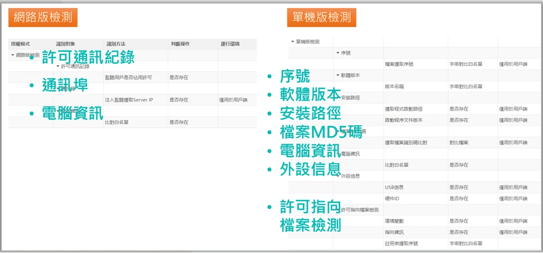 - 支援浮動授權、單機版、USB Dongle 等多種軟體類型。