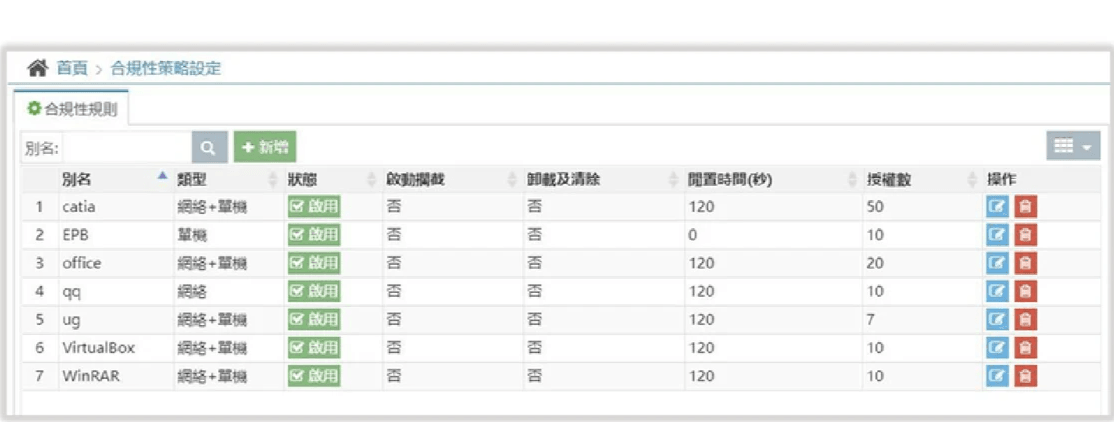 - 合規策略設定:支援多達 30 種合規性判斷規則,依軟體特性自動識別。